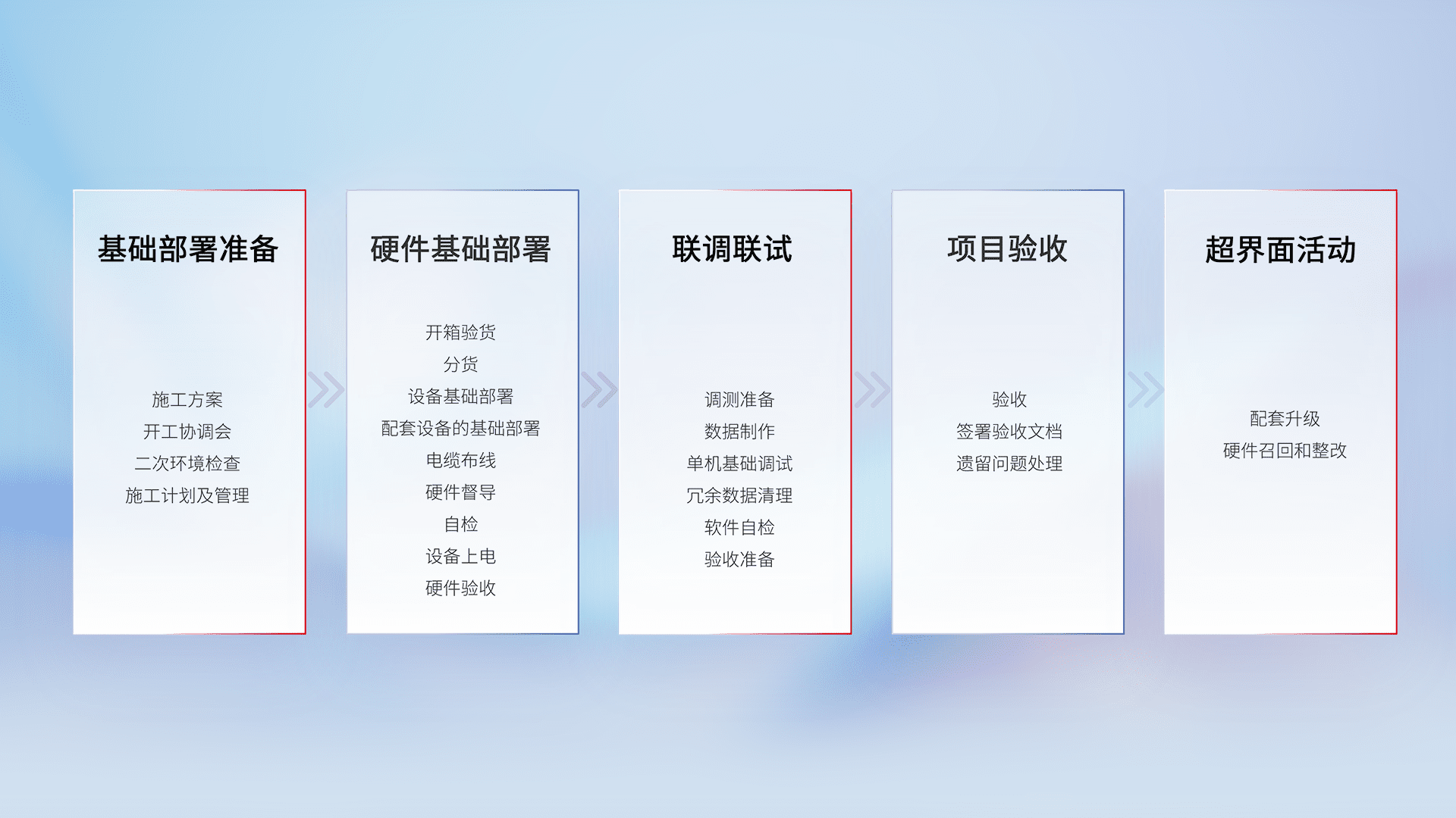 从基础部署准备、、、硬件基础部署、、联调联试、、、、项目验收、、、、越界面活动的全过程可追溯,,,,保证施工质量和进度。。。